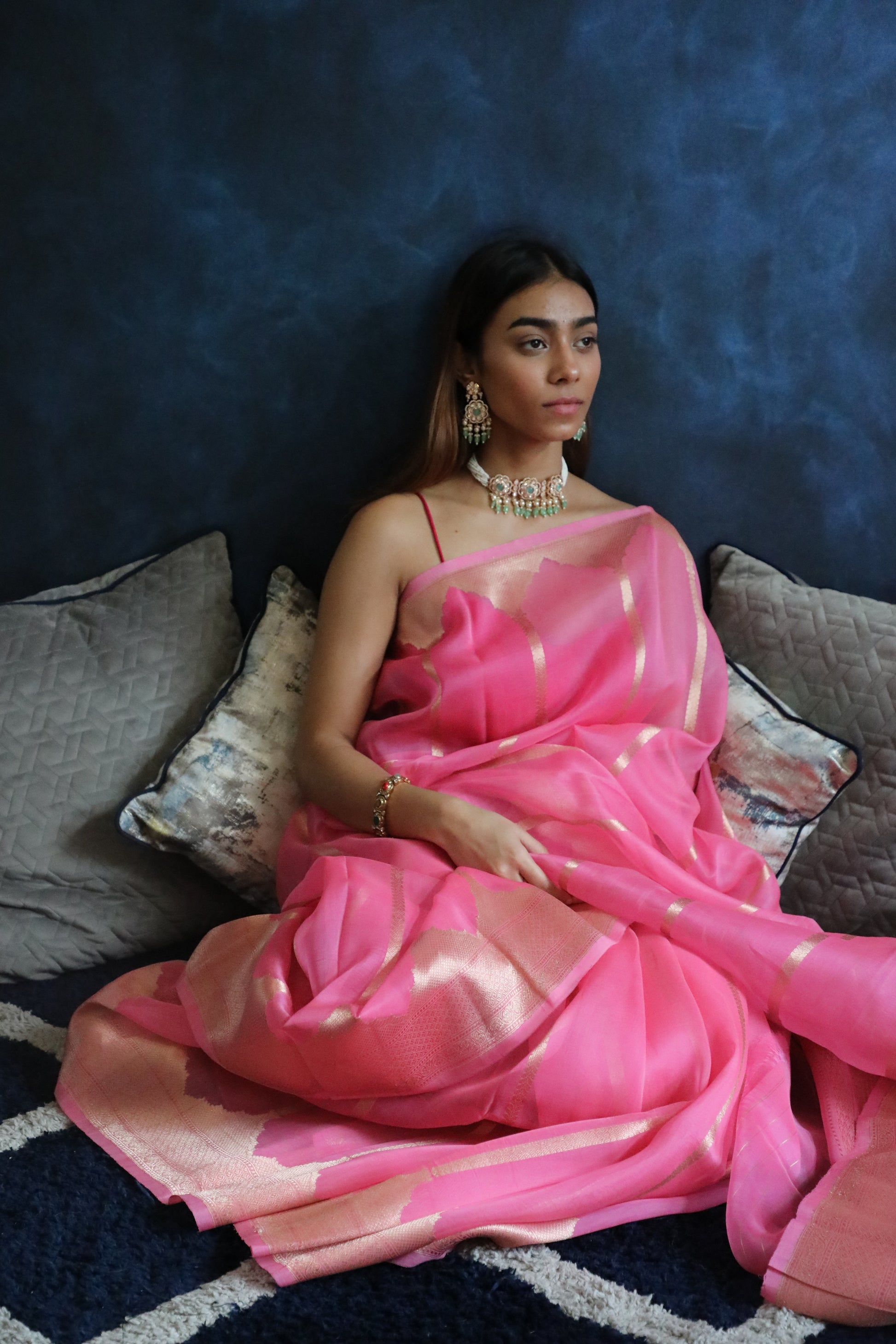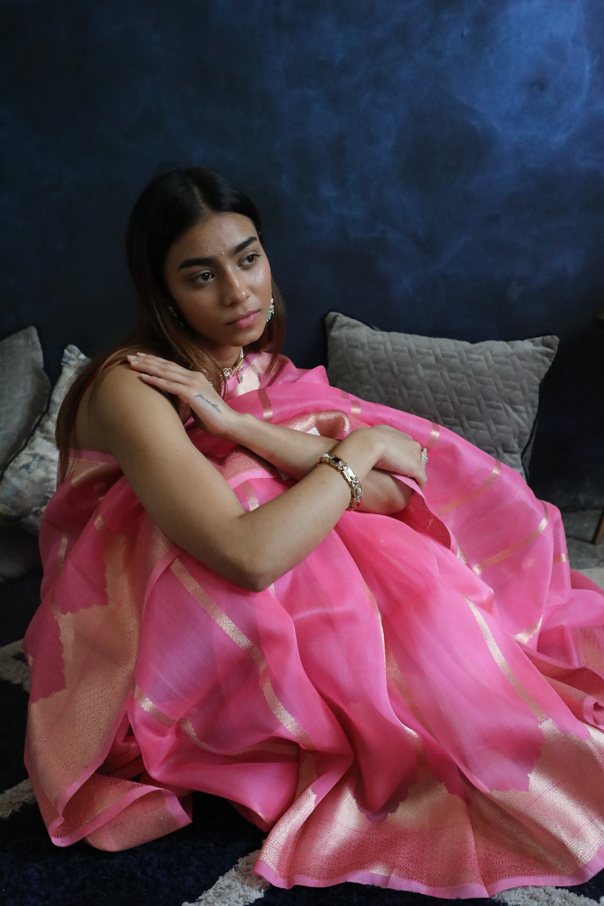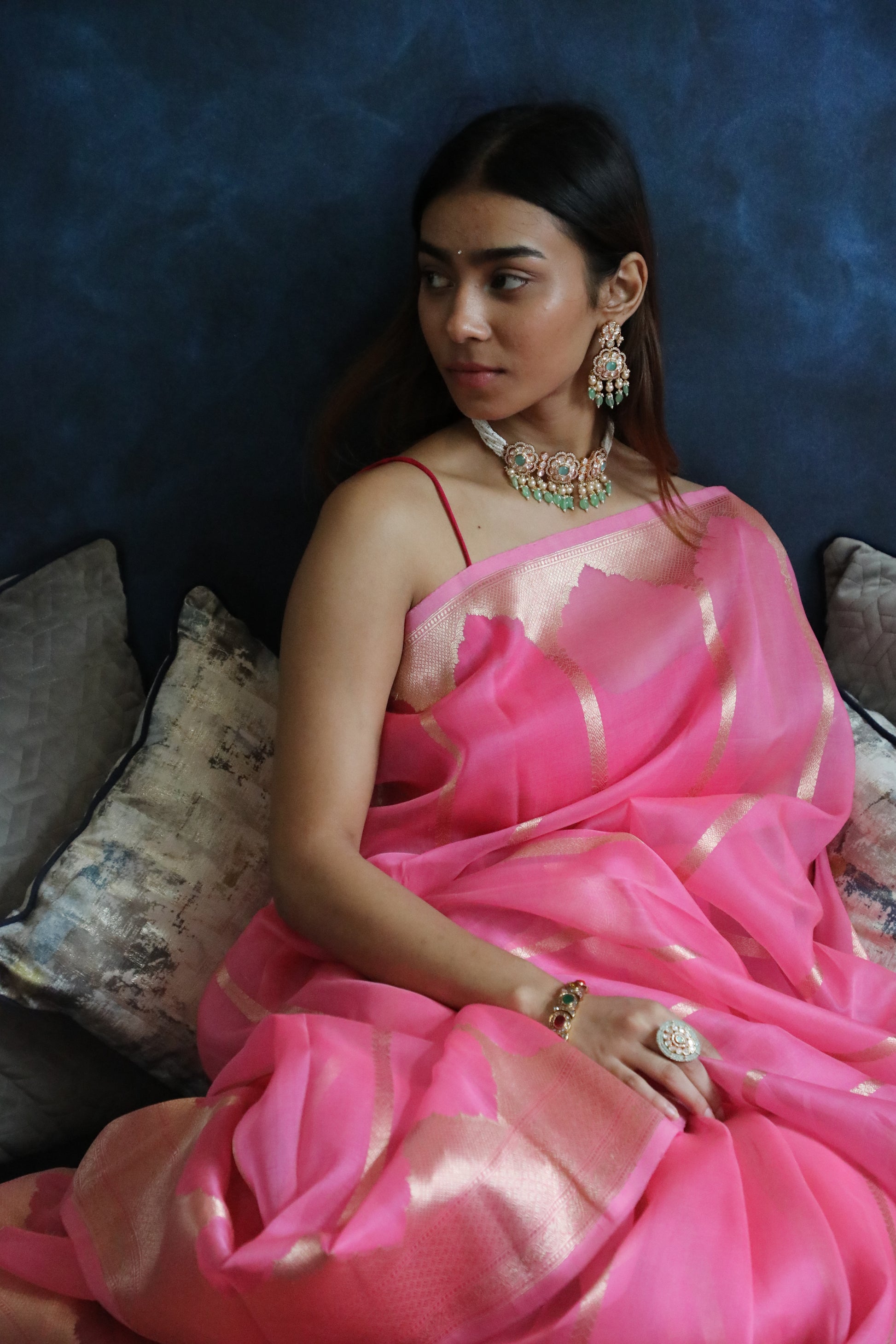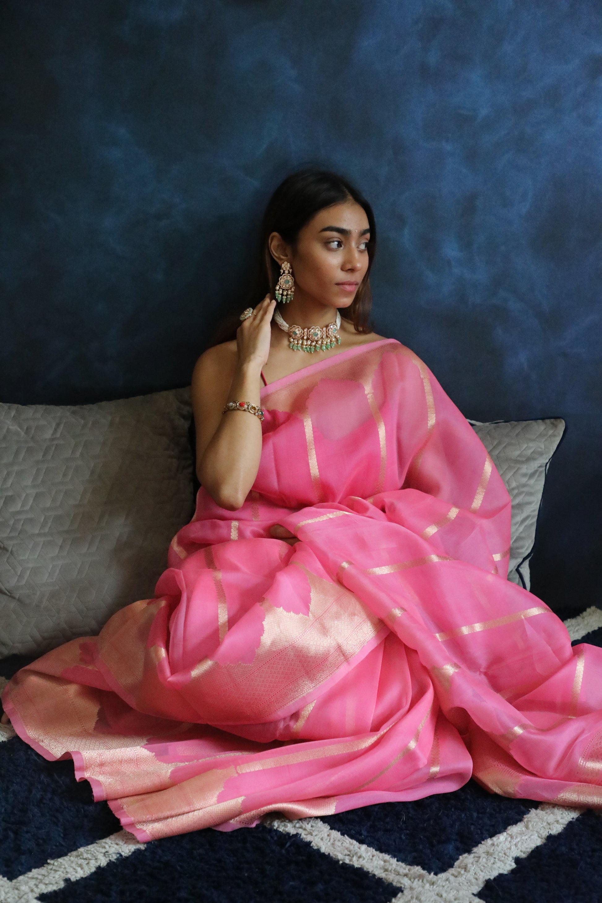 Handwoven in luxurious pure Banarasi Organza silk, this soft pink drape is a sheer marvel—feather-light, subtly shimmering, and infused with artisanal mastery.