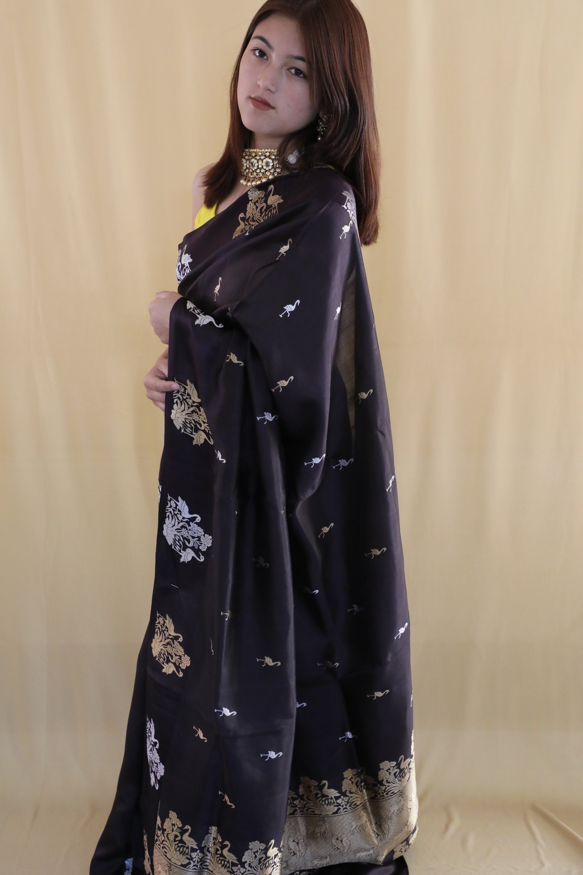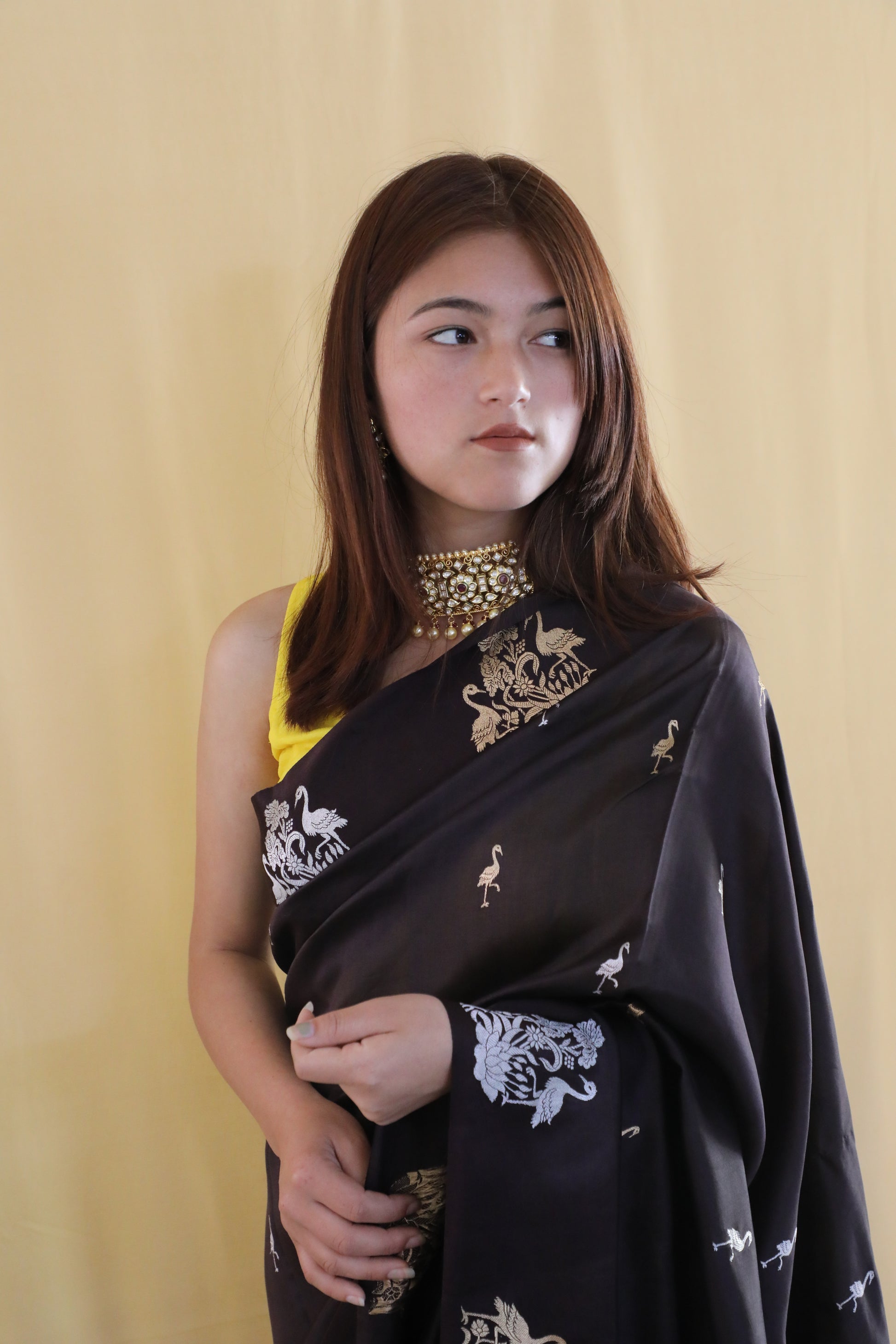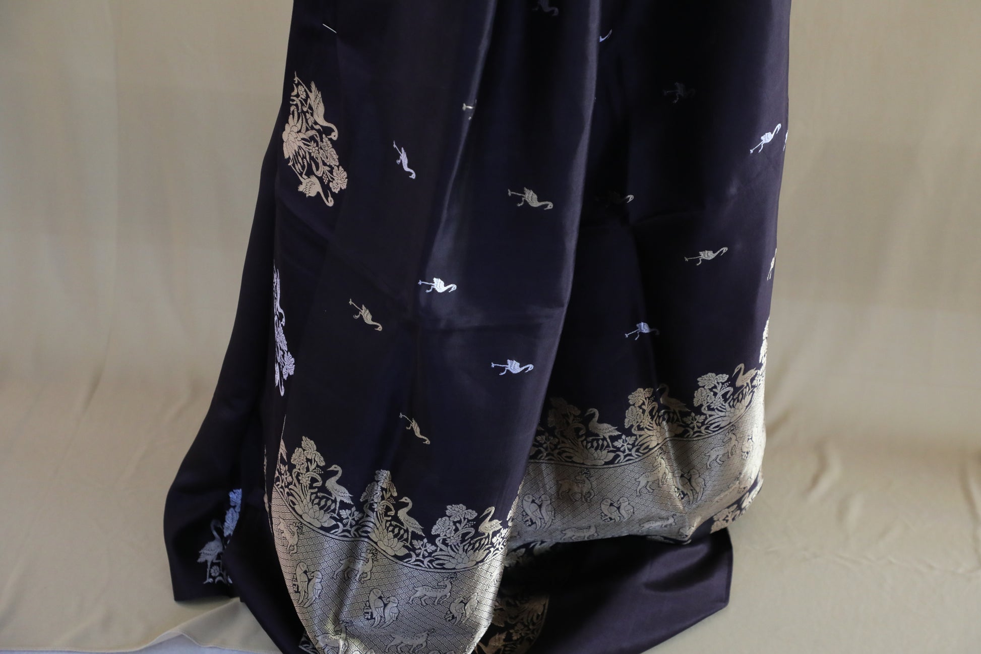 The saree's deep dark chocolate brown hue offers a sophisticated and rich canvas, reminiscent of fertile earth and twilight mystique. Adorning the border and pallu are exquisite handwoven crane motifs, intricately rendered to capture the bird's iconic grace. The crane, a powerful totem in many cultures, symbolizes longevity, purity, wisdom, and auspicious new beginnings. Its serene presence on this pure silk saree speaks to ancient traditions and enduring beauty.